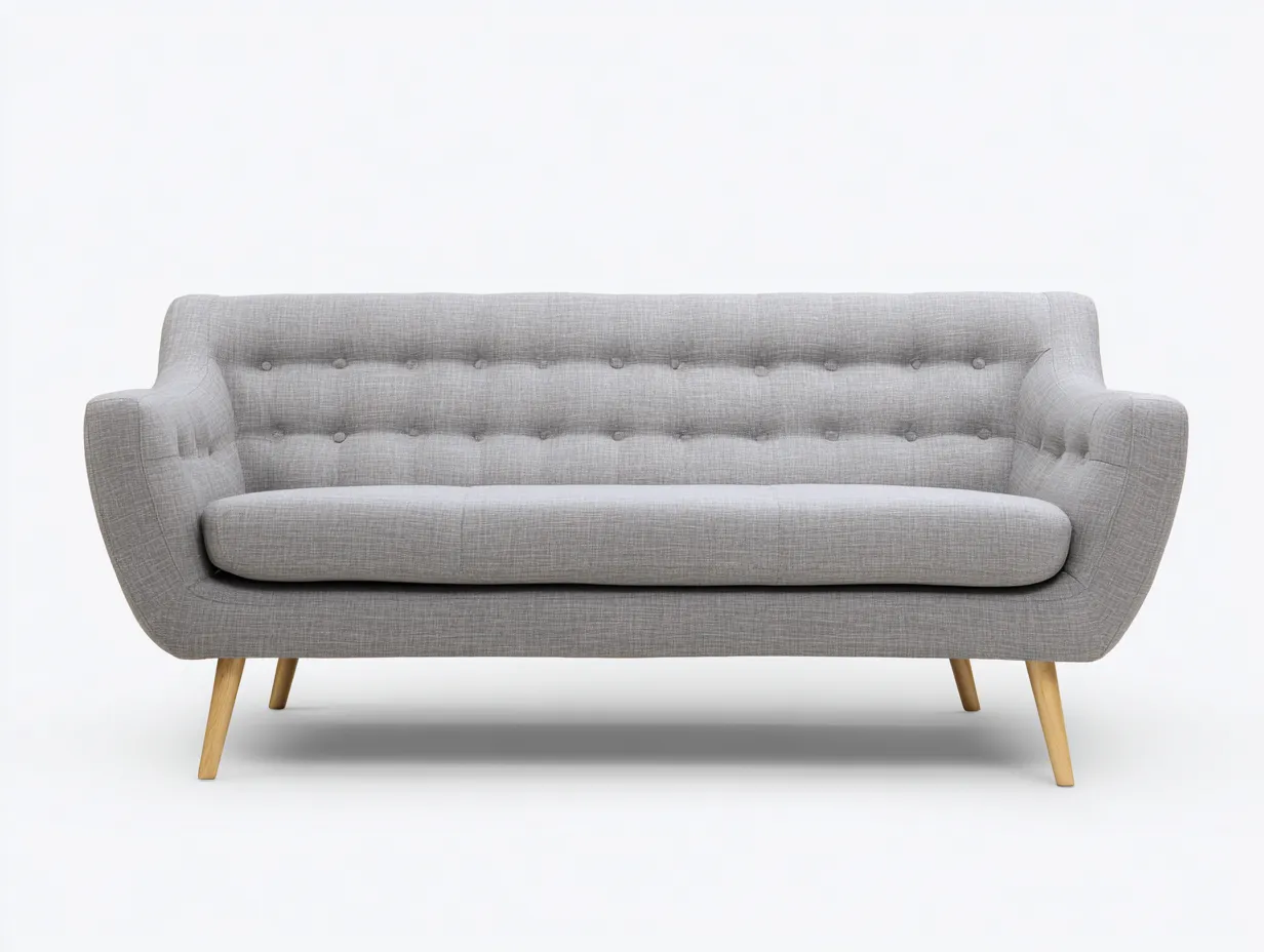 Le revêtement en tissu gris clair présente un aspect chiné discret qui renforce la sensation de douceur visuelle. La structure intérieure est pensée pour un usage régulier, avec un rembourrage confortable au niveau de l assise et du dossier. Les pieds en bois clair apportent une touche naturelle et soutiennent la ligne légère du canapé.