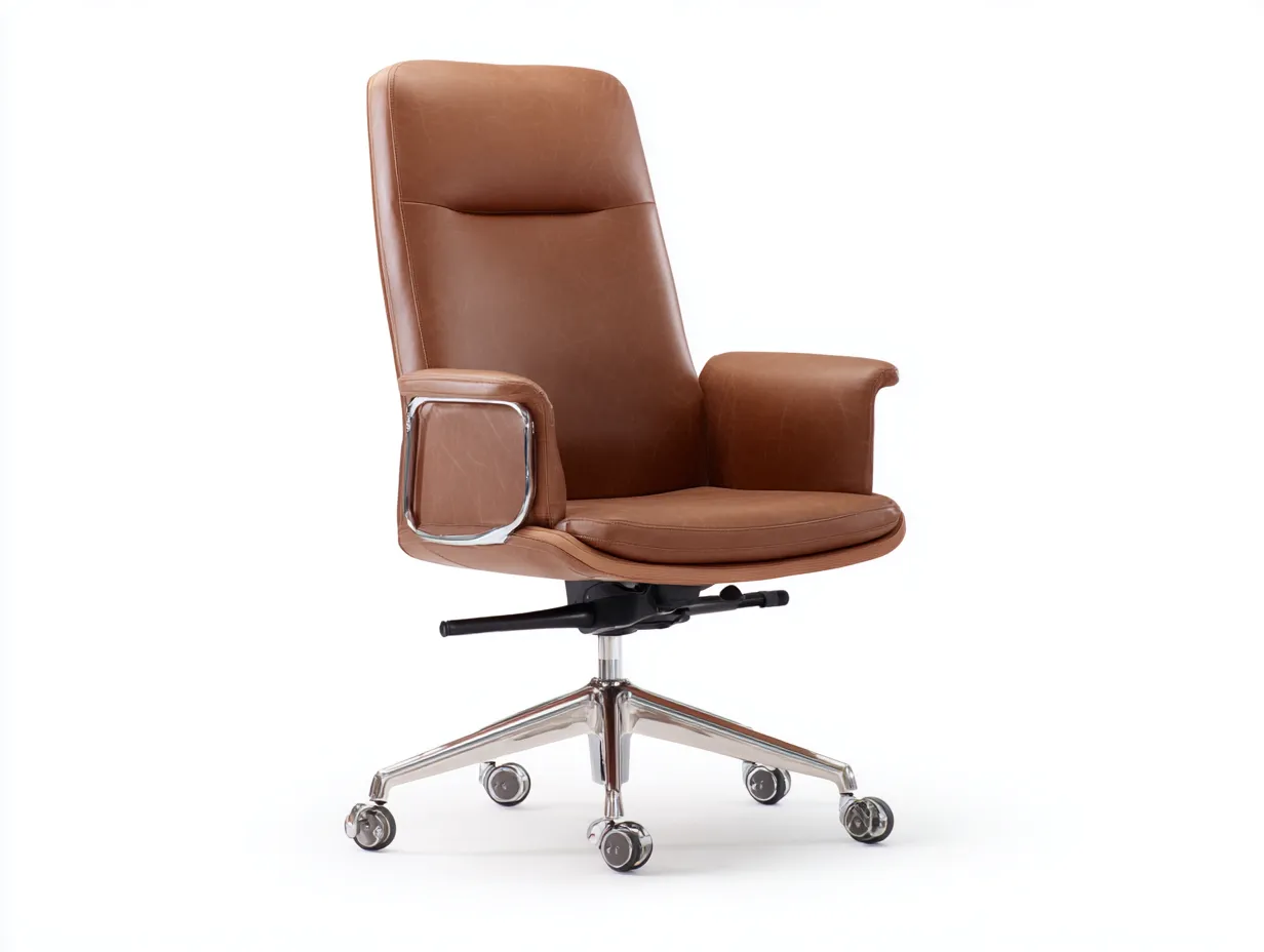 Le siège est recouvert d'un revêtement effet cuir de couleur brun tabac, avec rembourrage sur l'assise, le dossier et les accoudoirs pour un confort adapté à un usage régulier. La base à cinq branches en métal finition chromée assure une bonne stabilité, tandis que les roulettes facilitent les déplacements autour du poste de travail. Les éléments visibles sont pensés pour offrir une finition propre et cohérente.