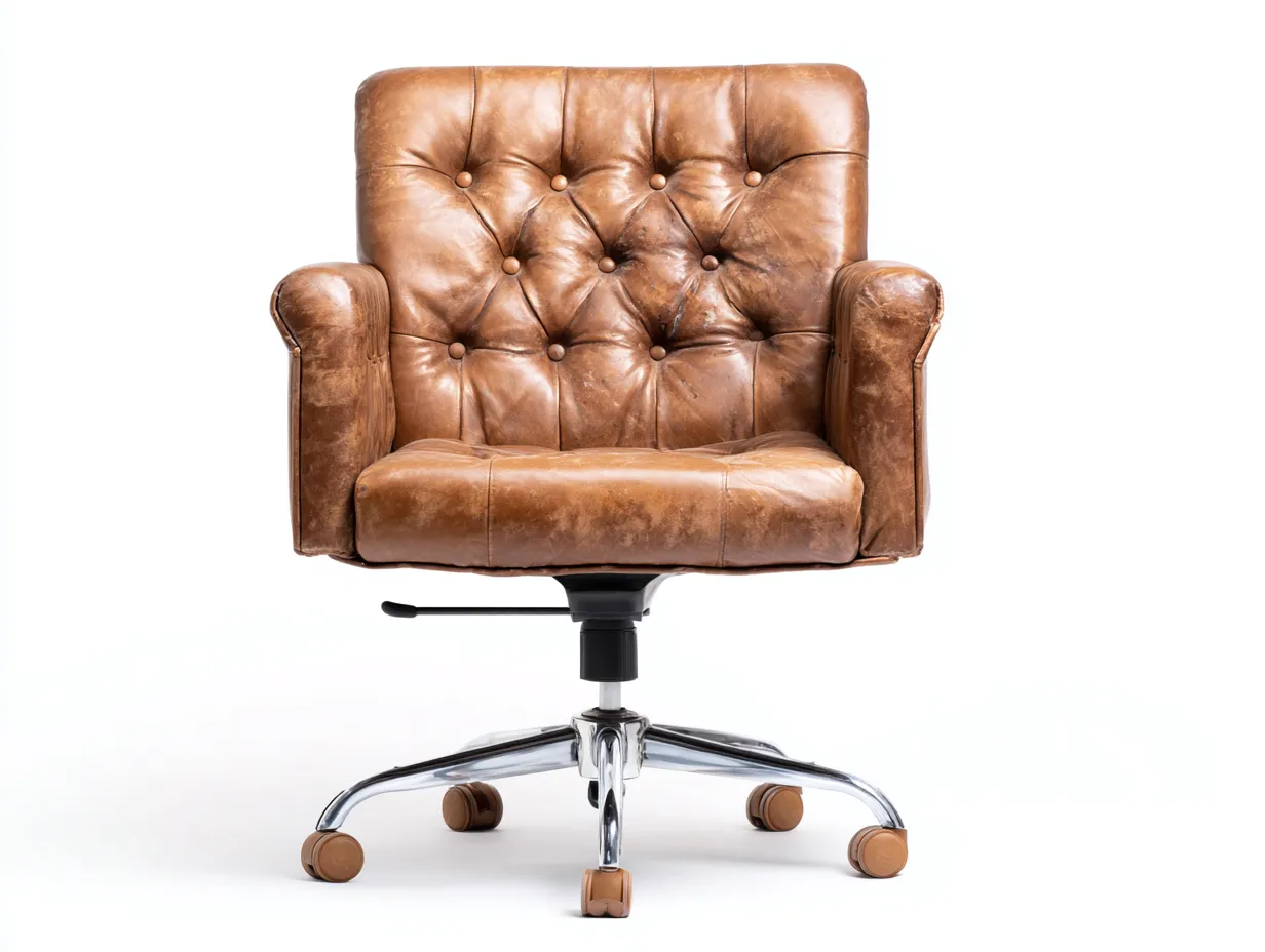 Le revêtement en cuir véritable brun vieilli présente des nuances naturelles qui renforcent l identité du modèle. Le dossier et l assise sont rembourrés pour offrir un confort équilibré au quotidien. Les accoudoirs intégrés prolongent la ligne du fauteuil, tandis que la base en métal chromé avec roulettes assure stabilité et mobilité dans l espace de bureau.